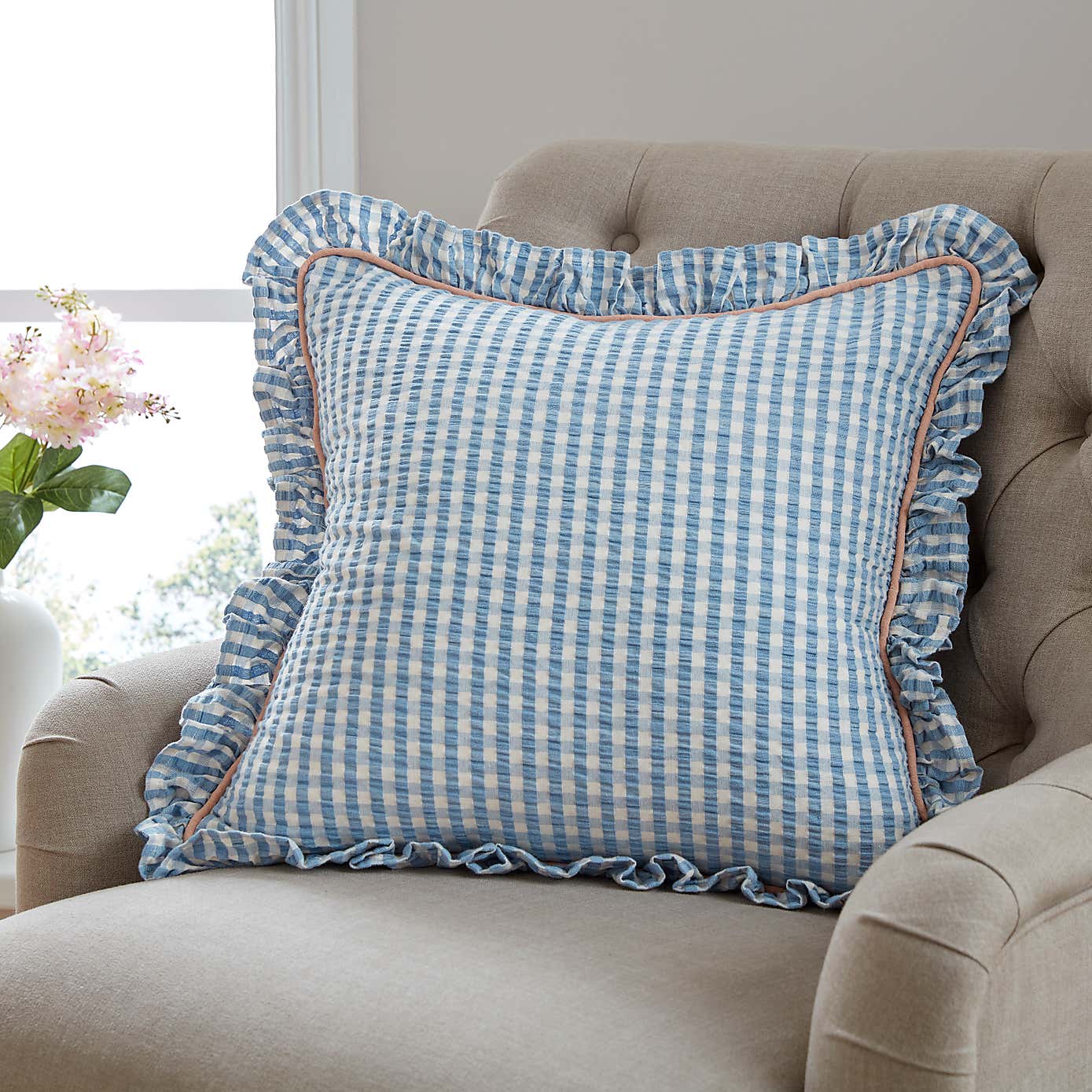 Seersucker Gingham Frill Cotton Square Cushion
