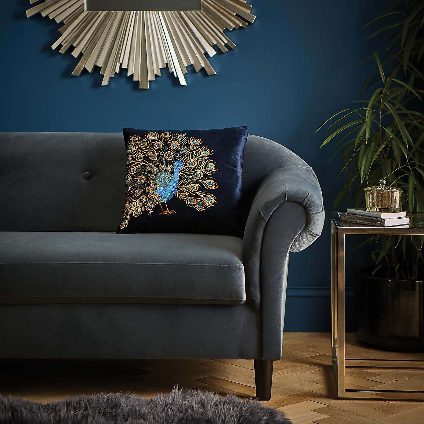 Navy Embroidered Peacock Cushion
