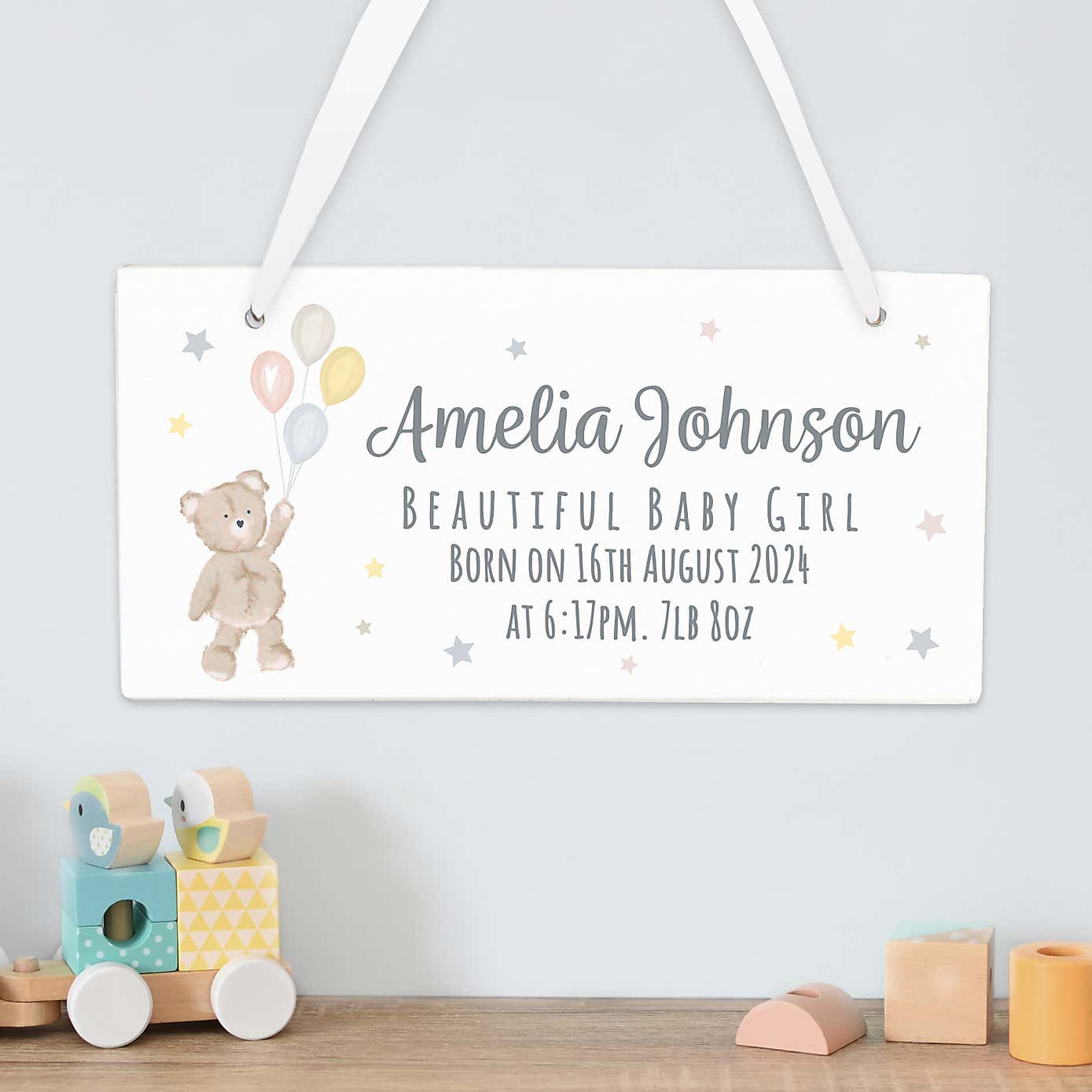 Personalised Teddy and Balloons White Wooden Sign