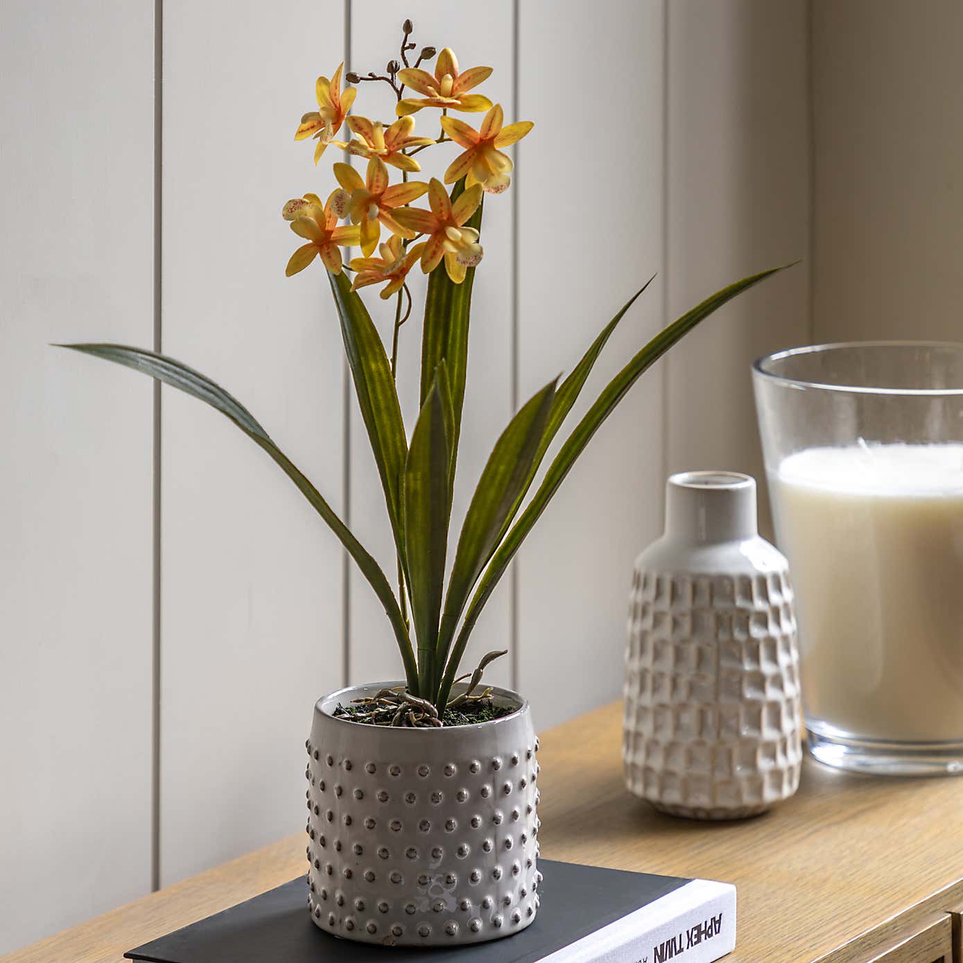 Artificial Orange Orchid in Ceramic Pot